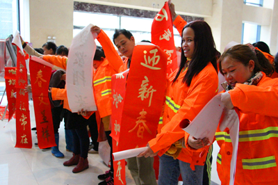 “春滿人間百花吐艷 福臨小院四季常安” “一帆風順年年好 萬事如意步步高” ……1月26日至28日,麗匯大廈一樓熱鬧非凡,為了感激社會各界對綠港集團的關心與支持,由綠港集團工會組織的書法家“迎新春 送祝福”義務送春聯活動吸引了大量前來求墨寶的社會各界人士。三位南寧市書法協會的書法家以及南寧科巨公司副總經理陸章發為觀眾們現場揮毫,一幅幅金燙燙、散發著墨香的春聯映襯著人們的笑臉,整個現場彌漫著濃濃的年味,短短三天時間便送出了2000多副春聯。1月26日上午,綠港集團工會還啟動了派送春聯儀式,綠港集團工會主席黃麗琴帶領工會人員將春聯送到經開區40余位保潔人員、園林綠化工人、公司職工的手上。(張彩秀/文、圖)