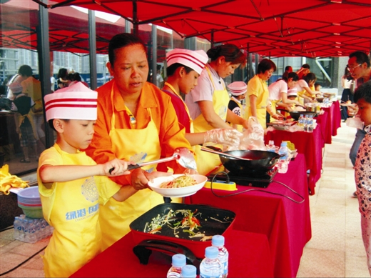 本報訊 昨日上午,南寧經濟技術開發區在綠港·國際中心開展了以“關愛農民工·綠港小廚神”親子活動,吸引了南寧經開區園林綠化工人、水電維修物業工人、保潔人員等300多名進城務工人員及其子女參加。在活動現場,參賽小選手們在父母的指導下井井有條地備菜、炒菜、起鍋,忙得不亦樂乎。