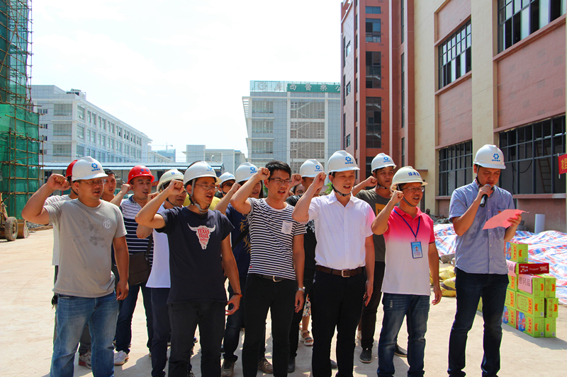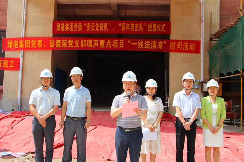 當天,驕陽似火。綠港集團黨委書記、董事長、總經理龔國強莊重地給黨員們授予“黨員先鋒隊”紅旗,給青年突擊隊員們授予“青年突擊隊”紅旗,并提出了幾點要求:一是要緊緊圍繞項目建設開展突擊活動。全體黨員干部和青年同志要充分發揚不怕吃苦、勇于負重,敢打硬仗、能打硬仗的優良傳統,切實發揮“黨員先鋒隊”、“青年突擊隊”在“急、難、險、重”任務中的生力軍作用。二是要把項目建設與錘煉黨員意志相結合。黨員干部和青年同志們要充分發揮模范帶頭作用,深入項目一線,了解項目建設困難,想方設法協調解決。要在項目建設中增強本領、錘煉意志、增強黨性,更好的服務入區企業建設發展。三是要充分發揮“黨建帶團建”作用。“黨員先鋒隊”要引導和指導好“青年突擊隊”開展好項目建設,黨員干部與青年同志們要相互關心,密切配合,充分發揮整體功能和團隊精神,確保瑞聲廠房項目能在6月25日完工交付9號廠房、7月25日完工交付3、13號廠房的任務目標。