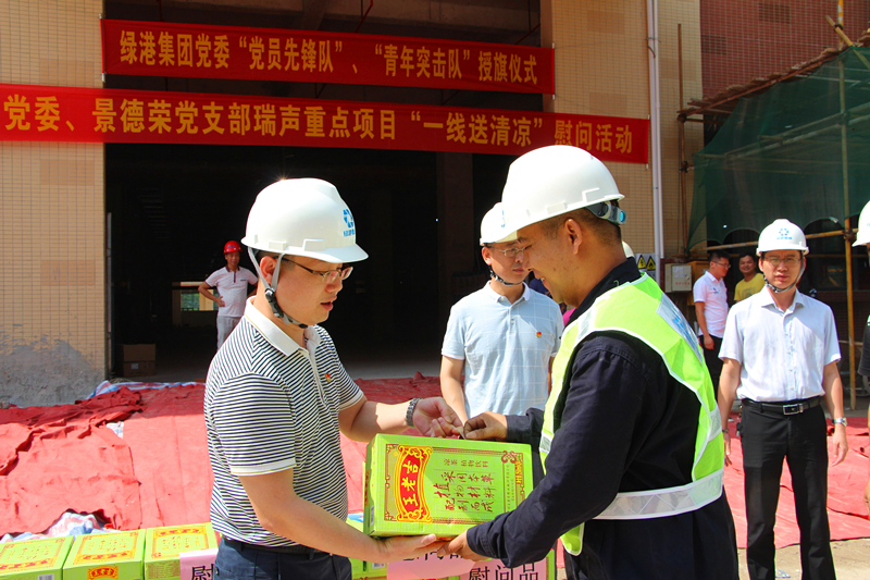 此次活動也是綠港集團黨委在今年開展“四個一線”爭先鋒、創建黨建示范品牌工作以來,在項目建設一線開展創建“黨員攻堅先鋒隊”活動的重要舉措之一。“四個一線”是綠港集團黨委圍繞經開區黨工委加強基層黨建三年行動計劃,結合集團公司項目建設、企業服務、招商銷售、項目融資的四個任務,以“抓黨建促發展,抓品牌促提升”為主題,組織號召廣大黨團員積極開展在項目一線創建“黨員攻堅先鋒隊”、在服務企業一線創建“服務示范標兵(窗口)”、在招商銷售一線創建“一個黨員一面旗,我為綠港做代言”、在項目融資一線“爭做黨員領頭雁”的活動。活動開展以來,集團黨建真正實現了“走前頭、作表率”的目標,引導集團公司全體黨員干部轉變工作作風、提高工作效能、強化服務意識,在促進綠港集團樹立國企黨建標桿,不斷提升社會形象起到引領作用。授旗儀式結束后,綠港集團與會領導還給項目一線參建人員送上了王老吉、西瓜水果等清涼慰問品,鼓勵他們繼續發揚綠港鐵軍精神,急難險重顯身手,同時要注意防暑降溫、保重身體,更好地為項目建設做貢獻。(綠港集團 陽正輝、張彩秀/文、圖)
