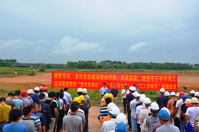 當天,細雨蒙蒙,綠港集團黨委書記、董事長、總經理龔國強在項目現場給參建黨員授予了“黨員先鋒隊”旗幟,給參建團員青年授予了“青年突擊隊”旗幟,綠港集團副總經理、工會主席黃麗琴給吳圩空港經濟區重點項目推進組授予了“工人先鋒號”錦旗,激勵廣大黨員干部青年同志們要以強烈的政治責任感、立足本職崗位,充分發揚不怕吃苦、勇于負重,敢打硬仗、能打硬仗的“綠港鐵軍”優良傳統,為吳圩空港經濟區項目建設做貢獻。
