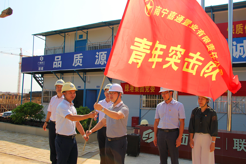 在授旗儀式中,集團黨委書記、董事長、總經理龔國強對南寧科技產業園項目人員前期所做出的工作給予了充分肯定,贊揚了黨員先鋒隊員、青年突擊隊員和工人朋友們為項目建設所付出的艱苦和努力,當前項目進展取得了較好的成績。自8月12日南寧科技產業園項目正式開工以來,嘉通公司黨支部帶領工人們日夜苦干,千方百計克服惡劣的臺風天氣等不利因素,在短短的2個月時間便完成1#樓廠房一層的搭設模板,2#、3#樓回填基礎土方,4#樓防水保護層澆筑以及9#宿舍樓基礎承臺澆筑等工作,充分展現了綠港鐵軍風采。下一步,希望全體黨員先鋒隊、青年突擊隊隊員們以此次授旗為契機,繼續發揚綠港鐵軍精神,創先爭優,攻堅克難,加快推進項目建設,確保項目如期建成交付。