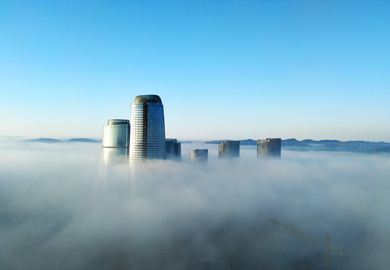 《晨曦 綠港》(榮鑫公司 趙志業)圖片說明:綠港國際中心在晨曦和白霧的襯托下,顯得格外漂亮。