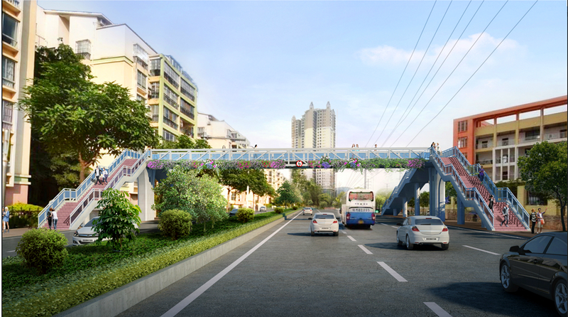 經開區一小人行天橋工程總投資800萬元,總長34.98米,總寬3.8米,步梯總長約90.8米,寬約2.24米。天橋上部結構采用一跨29.74米鋁合金桁架結構,主橋桁架高度4.355米,步道采用鋁合金結構板;下部結構采用T型鋼結構橋墩接承臺,基礎采用鉆孔灌注樁基礎。工程工期為6個月,預計2021年5月建成并投入使用。