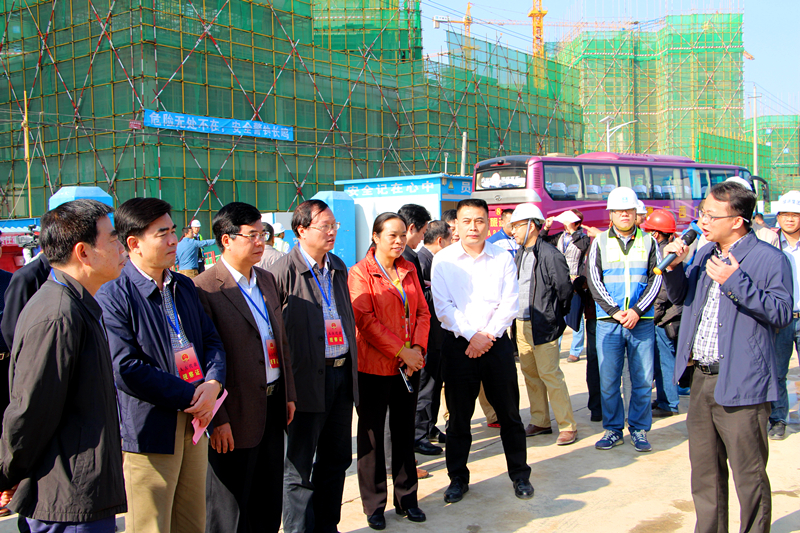 視察組一行在經開區管委會辦公區聽取管委會全年工作匯報后,首先來到自治區為民辦實事棚戶區改造項目——新港家園項目現場調研指導工作。綠港集團黨委書記、董事長、總經理楊東向人大代表們匯報了新港家園項目建設情況,他說,新港家園作為自治區為民辦實事統籌推進的棚戶區改造項目,承擔著經開區吳圩鎮被征地拆遷農民的安置任務,事關空港經濟區建設發展的大局。綠港集團作為建設業主,積極貫徹落實自治區、南寧市、經開區相關決策部署,根據“讓利于民、統一規劃、統一建設”總體開發思路,充分發揮綠港鐵軍精神,通過創新項目管理模式,抽調精干力量,狠抓工程質量,快速有序的推進項目建設工作。